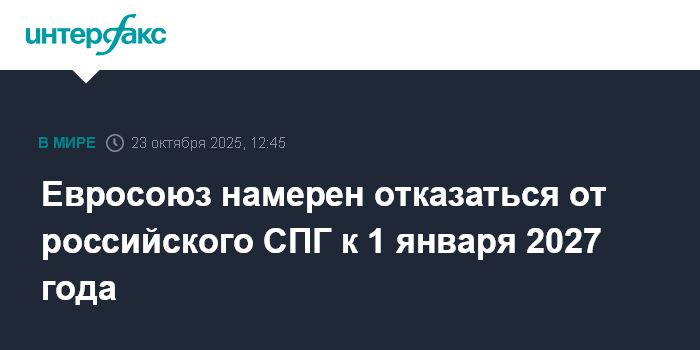 Москва. 23 октября. INTERFAX.RU - Страны ЕС к 1 января 2027 году завершат процесс отказа от российского СПГ, говорится в опубликованном в четверг 19-м пакете санкций Евросоюза против РФ.
