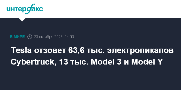 Tesla отзовет 63,6 тыс. электропикапов Cybertruck, 13 тыс. Model 3 и Model Y