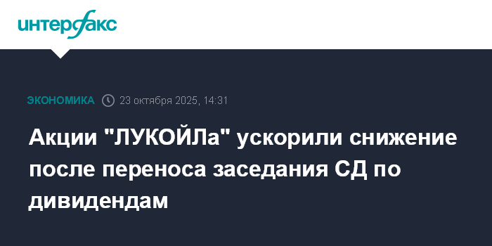 Москва. 23 октября. INTERFAX.RU - Акции "ЛУКОЙЛа" днем в четверг ускорили снижение после новостей о том, что намеченное на 23 октября заседание совета директоров, на котором планировалось рассмотреть рекомендацию по дивидендам за девять месяцев 2025 года, было перенесено.