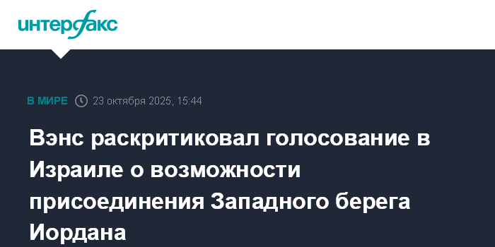 Москва. 23 октября. INTERFAX.RU - Вице-президент США Джей Ди Вэнс заявил, что предложение о присоединении к Израилю Западного берега реки Иордан, которое получило поддержку накануне на предварительном голосовании в израильском парламенте, показалось ему неуместным.
