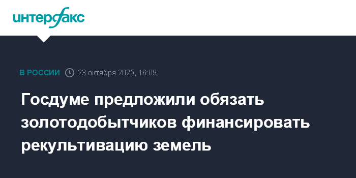 Москва. 23 октября. INTERFAX.RU - Группа депутатов Госдумы во главе с председателем комитета по природным ресурсам Дмитрием Кобылкиным внесла в парламент законопроект № 1050064-8, который вводит для золотодобытчиков обязательное финансовое обеспечение рекультивации земель, нарушенных при добыче золота.