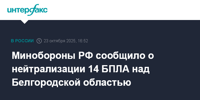Минобороны РФ сообщило о нейтрализации 14 БПЛА над Белгородской областью