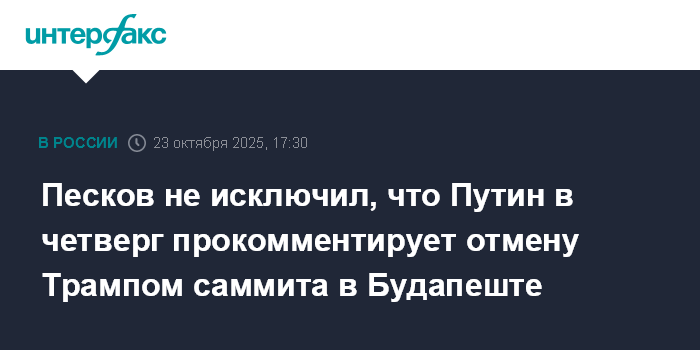 Москва. 23 октября. INTERFAX.RU - Президент РФ Владимир Путин, возможно, прокомментирует ситуацию с отказом президента США Дональда Трампа провести российско-американский саммит в Будапеште, сообщил пресс-секретарь главы российского государства Дмитрий Песков.
