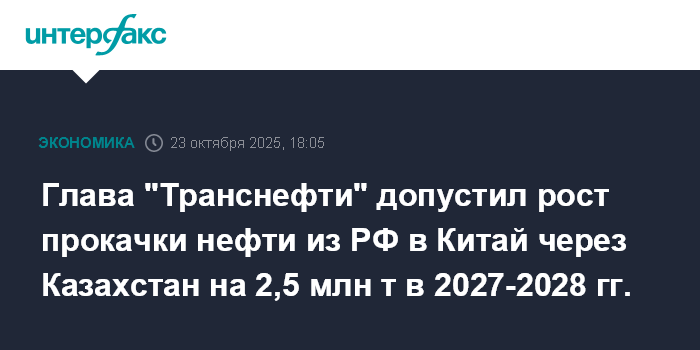 Глава "Транснефти" допустил рост прокачки нефти из РФ в Китай через Казахстан на 2,5 млн т в 2027-2028 гг.
