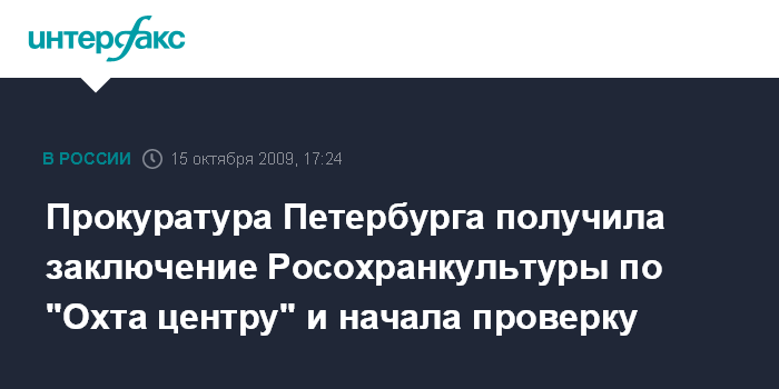 Москва. 15 октября. INTERFAX.RU - В прокуратуру Петербурга поступило обращение министерства культуры РФ с заключением Росохранкультуры, в котором указывается на нарушения законодательства при выдаче разрешения на отклонение от предельных параметров строительства по высоте для доминанты общественно-делового районе "Охта центр".