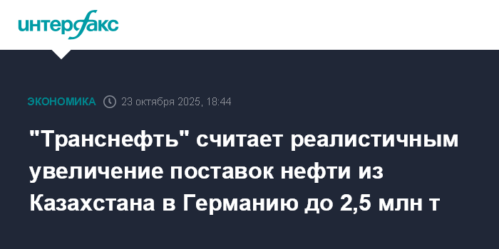 Москва. 23 октября. INTERFAX.RU - "Транснефть" считает реалистичным увеличение поставок нефти из Казахстана в Германию через РФ до 2,5 млн тонн в год.