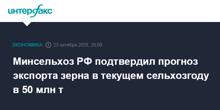 Москва. 23 октября. INTERFAX.RU - Минсельхоз РФ подтвердил прогноз экспорта зерна в текущем сельхозгоду (июль 2025 - июнь 2026 гг.) в объеме 50 млн тонн.