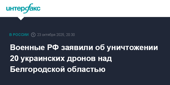 Москва. 23 октября. INTERFAX.RU - Средства противовоздушной обороны сбили 20 украинских беспилотников самолетного типа над Белгородской областью, сообщили в Минобороны РФ в четверг.