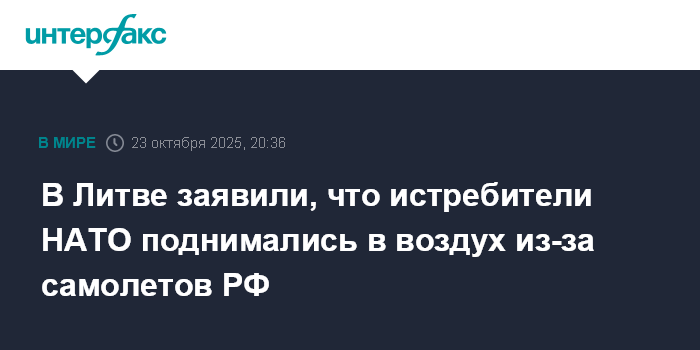 Москва. 23 октября. INTERFAX.RU - В Литве по тревоге подняты истребители миссии НАТО по патрулированию воздушного пространства, сообщила в четверг пресс-служба литовского Минобороны.