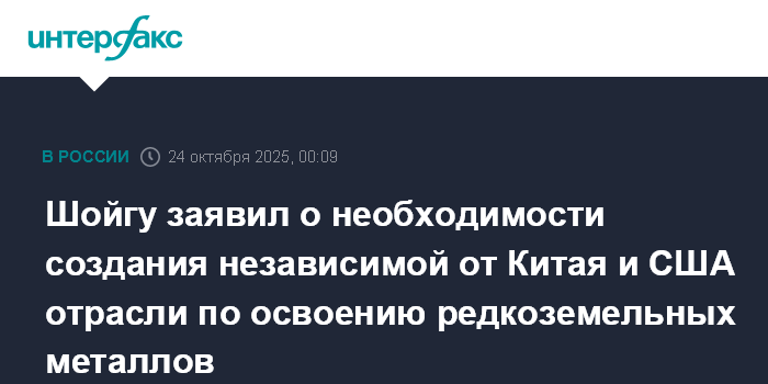 Москва. 24 октября. INTERFAX.RU - России необходимо создать "суверенную отрасль" по освоению редкоземельных металлов, независимую от Китая и США, заявил секретарь Совета безопасности РФ Сергей Шойгу.