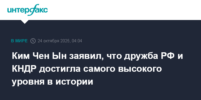 Москва. 24 октября. INTERFAX.RU - Дружба между Россией и КНДР на данном этапе достигла наивысшей точки, и она будет вечной, заявил северокорейский лидер Ким Чен Ын.