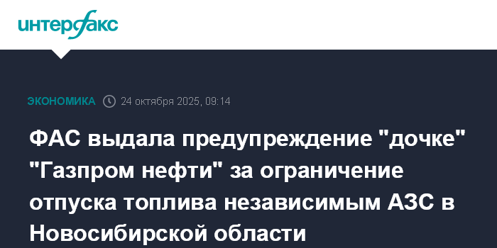 В ходе анализа полученных данных новосибирское УФАС России не выявило экономических, технологических и иных обстоятельств, которые могли привести к ограничению отпуска моторного топлива независимым участникам. Управление выдало ООО "Газпромнефть-Региональные продажи" предупреждение - организации необходимо до 22 ноября 2025 года прекратить создание дискриминационных условий на розничном рынке топлива. В случае неисполнения служба возбудит антимонопольное дело.