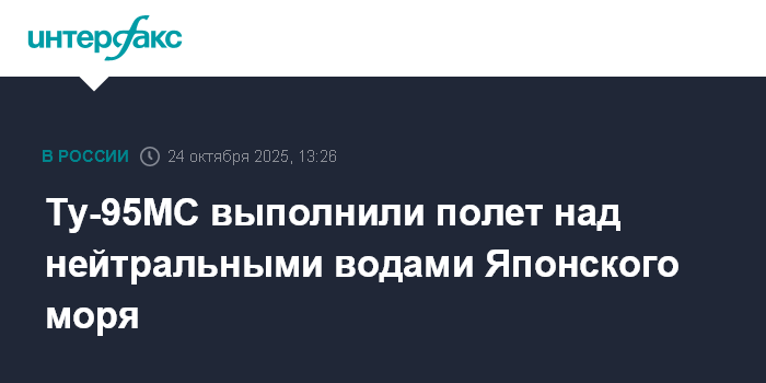 Москва. 24 октября. INTERFAX.RU - Стратегические ракетоносцы Ту-95МС выполнили плановый полет в воздушном пространстве над нейтральными водами Японского моря, на отдельных этапах их сопровождали истребители иностранных государств, сообщили в Минобороны РФ в пятницу.
