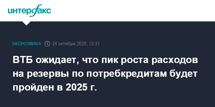 Москва. 24 октября. INTERFAX.RU - ВТБ ожидает, что пик роста расходов на резервы по необеспеченным кредитам будет пройден в 2025 году, заявил первый зампред банка Дмитрий Пьянов в ходе конференц-звонка с аналитиками.