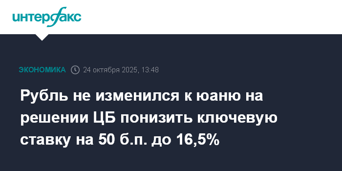 Москва. 24 октября. INTERFAX.RU - Рубль не изменился к китайскому юаню на Московской бирже в пятницу днем на решении Банка России понизить ключевую ставку на 50 базисных пунктов (б.п.), до 16,5%, так как такое решение было ожидаемо рынком среди других возможных вариантов.