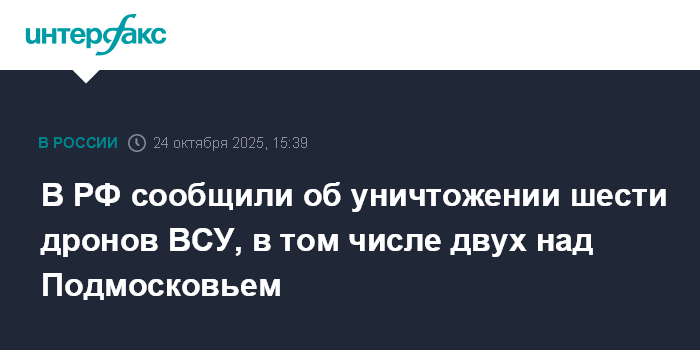 Москва. 24 октября. INTERFAX.RU - Средства противовоздушной обороны с 10:00 до 15:00 сбили шесть украинских беспилотников, сообщили в Минобороны РФ в пятницу.