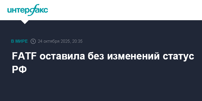 Москва. 24 октября. INTERFAX.RU - FATF (Группа разработки финансовых мер по борьбе с отмыванием денег - Financial Action Task Force) исключила Буркина-Фасо, Мозамбик, Нигерию и ЮАР из так называемого "серого" списка, то есть перечня юрисдикций, которые находятся под усиленным мониторингом организации, статус России остался прежним - ее членство в группе приостановлено, сообщается в информации, размещенной в телеграм-канале Росфинмониторинга.