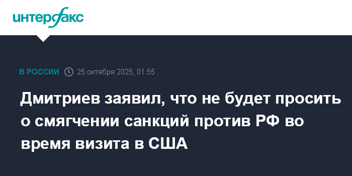 Москва. 25 октября. INTERFAX.RU - Спецпредставитель президента РФ по инвестиционно-экономическому сотрудничеству с зарубежными странами, глава Российского фонда прямых инвестиций Кирилл Дмитриев заявил, что в ходе своего визита в США не намерен добиваться смягчения санкций в отношении России.