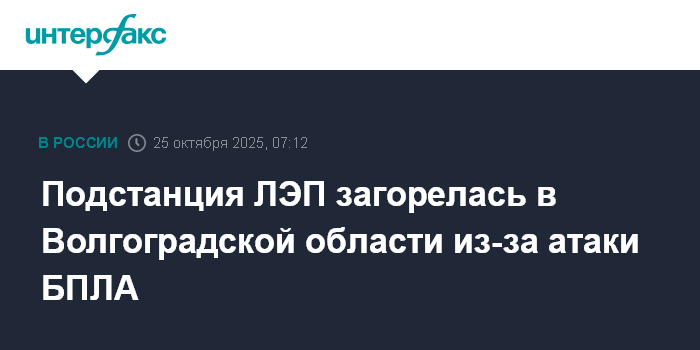 Москва. 25 октября. INTERFAX.RU - В Волгоградской области в результате массированной атаки БПЛА загорелась подстанция ЛЭП в Новониколаевском районе, пострадавших нет, сообщается утром в субботу в телеграм-канале обладминистрации.