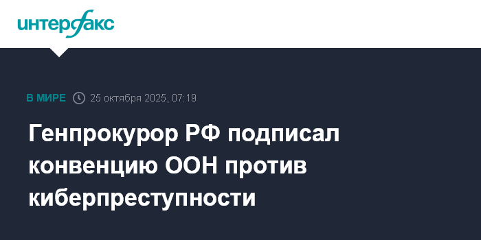Москва. 25 октября. INTERFAX.RU - Генеральный прокурор РФ Александр Гуцан подписал от имени России конвенцию ООН против киберпреступности.