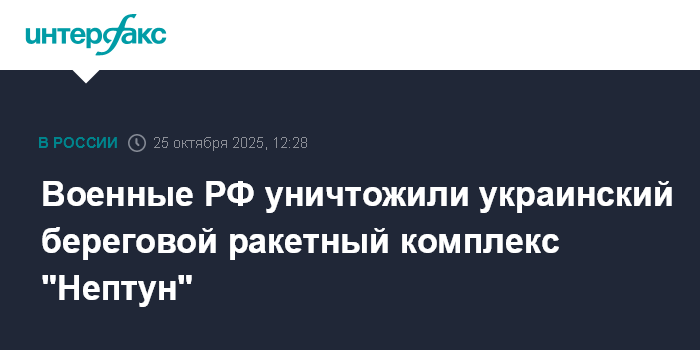 Москва. 25 октября. INTERFAX.RU - Российские военные сообщили, что в течение суток поразили пусковую установку берегового ракетного комплекса "Нептун" ВСУ.