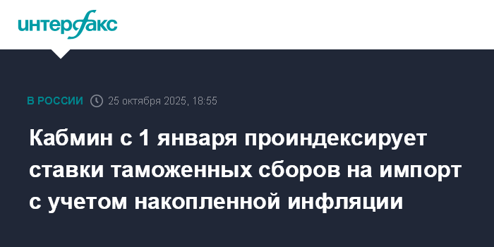 Москва. 25 октября. INTERFAX.RU - Ставки таможенных сборов на ввозимые в РФ товары с 1 января 2026 года будут проиндексированы с учетом уровня накопленной инфляции. Соответствующая инициатива предложена Минпромторгом РФ и поддержана правительством, сообщила пресс-служба министерства.