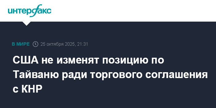 Москва. 25 октября. INTERFAX.RU - Госсекретарь США Марко Рубио заявил, что Вашингтон не откажется от поддержки Тайваня ради заключения торгового соглашения с Китаем, сообщает Bloomberg.