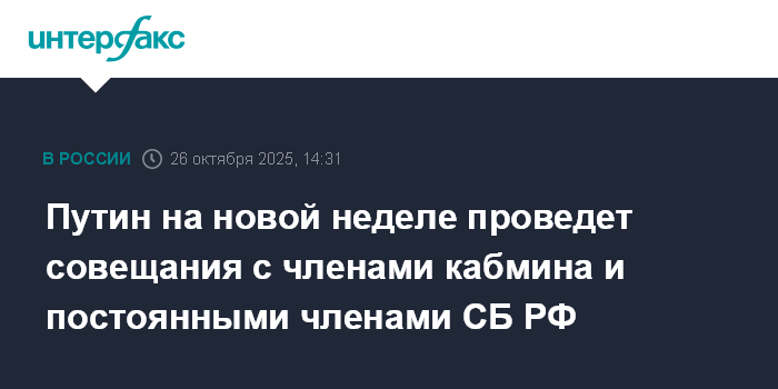 Москва. 26 октября. INTERFAX.RU - Президент РФ Владимир Путин на следующей неделе проведет совещания с членами правительства и с постоянными членами Совета безопасности, сообщает программа "Москва. Кремль. Путин" телеканала "Россия-1" (ВГТРК).