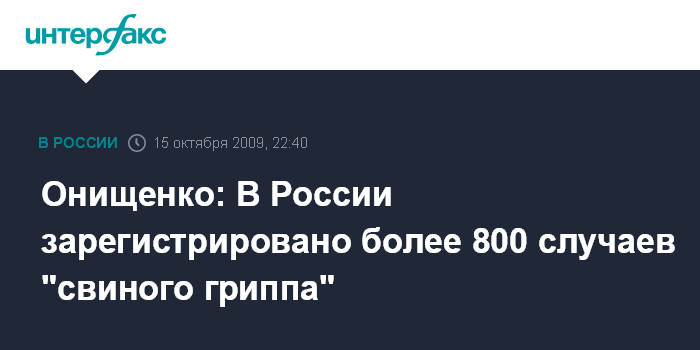 Как ранее сообщал Г.Онищенко, на 11 октября в России было зарегистрировано 709 случаев заболевания "свиным гриппом", из них 539 выявили у приехавших в РФ из-за рубежа. 9 октября сообщалось о 639 случаях свиного гриппа в России, 6 октября - о 591. По официальным данным Минздравсоцразвития, в России случаев смерти от свиного гриппа нет.