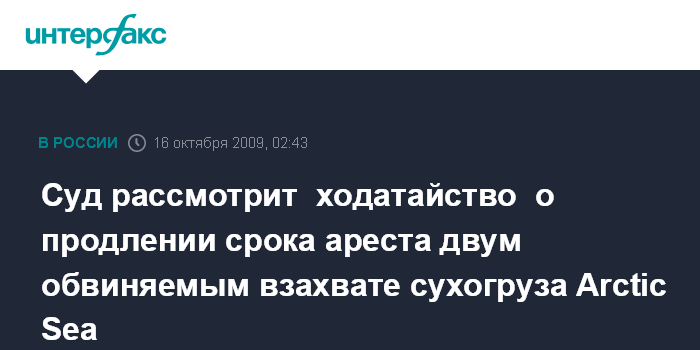 Суд рассмотрит ходатайство о продлении срока ареста двум обвиняемым взахвате сухогруза Arctic Sea