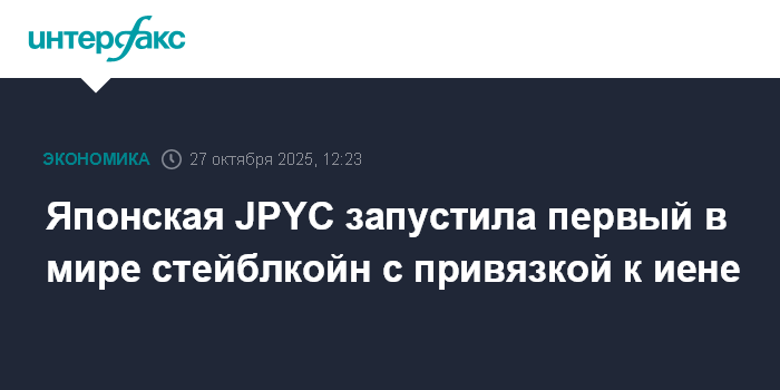 Москва. 27 октября. INTERFAX.RU - Японский стартап JPYC запустил первый в мире стейблкойн с привязкой к иене, пишет Reuters.