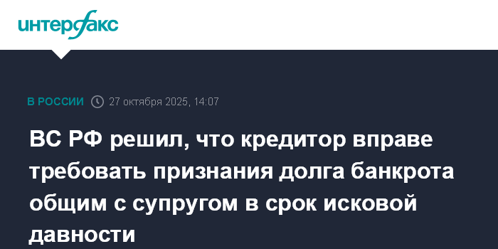Москва. 27 октября. INTERFAX.RU - Кредиторы ограничены трехлетним сроком для обращения в суд за признанием обязательства банкрота общим долгом с супругом, решил Верховный суд (ВС) РФ.