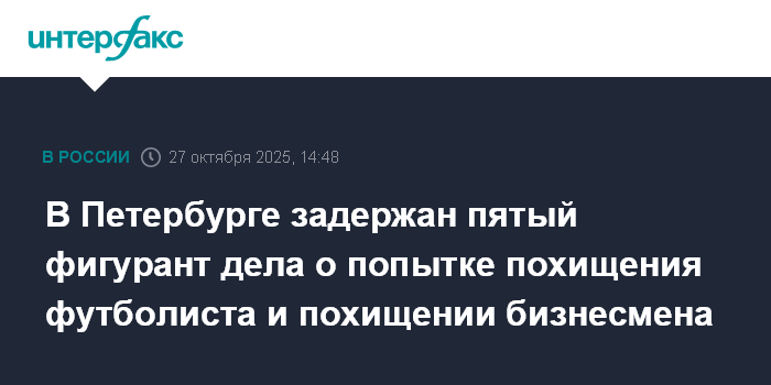 Москва. 27 октября. INTERFAX.RU - Пятый фигурант дела о похищении бизнесмена и попытке похищения футболиста задержан в Петербурге, сообщили "Интерфаксу" в понедельник в пресс-службе городского управления СКР.