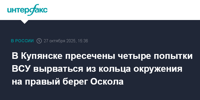 Москва. 27 октября. INTERFAX.RU - Российские военные пресекли в Купянске четыре попытки украинских подразделений вырваться из кольца окружения на правый берег реки Оскол по переправам в районе Петровки, сообщили в Минобороны РФ в понедельник.