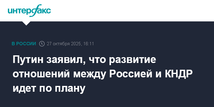 Москва. 27 октября. INTERFAX.RU - Все в отношениях России и КНДР идет по плану, заявил президент РФ Владимир Путин.