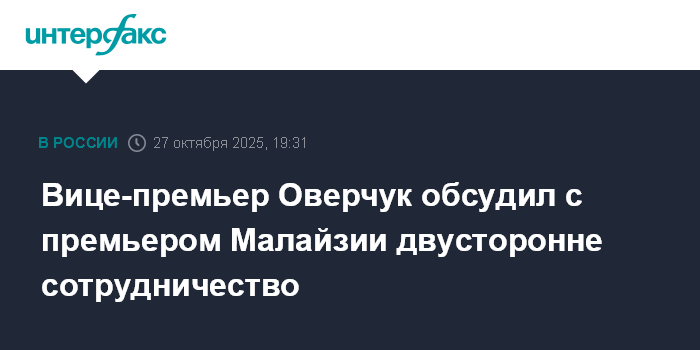 "Алексей Оверчук поздравил малайзийскую сторону с успешным председательством в АСЕАН и принятием Видения сообщества АСЕАН до 2045 года, которое будет определять магистральные пути развития ассоциации на следующие 20 лет, способствовать укреплению её устойчивости и роли в региональных процессах", - отмечается в сообщении.