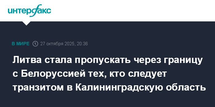 Москва. 27 октября. INTERFAX.RU - Литовская сторона в понедельник открыла один пункт пропуска на границе с Белоруссией для лиц, следующих транзитом в Калининградскую область РФ, сообщили в Государственном таможенном комитете Белоруссии.