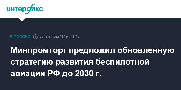 Москва. 27 октября. INTERFAX.RU - Минпромторг разработал обновленную версию стратегии развития беспилотной авиации (БАС) РФ до 2030-го и на перспективу до 2035 года, проект соответствующего распоряжения правительства вынесен на публичное обсуждение на портале regulation.gov.ru.