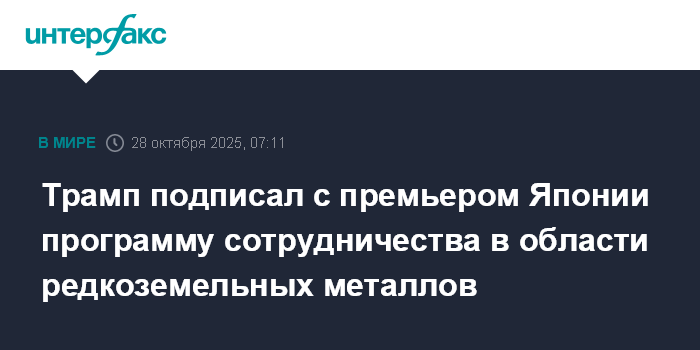 Москва. 28 октября. INTERFAX.RU - Президент США Дональд Трамп в ходе визита в Японию подписал с премьер-министром Японии Санаэ Такаити программу сотрудничества в области добычи и переработки редкоземельных металлов, сообщил Белый дом.