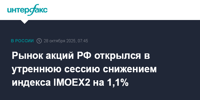 Москва. 28 октября. INTERFAX.RU - Рынок акций РФ на старте торгов утренней сессии на Мосбирже во вторник сохранил негативный импульс начала недели на фоне геополитической неопределенности, ухудшения прогнозов ЦБ РФ на 2026 год после снижения ключевой ставки на 0,5 процентного пункта (до 16,5% годовых), а также просевшей нефти (фьючерс на Brent торгуется у $65,6 за баррель). Индекс IMOEX2 за минуту торгов упал на 1,1%, ниже отметки 2450 пунктов.