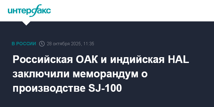 Москва. 28 октября. INTERFAX.RU - ПАО "Объединенная авиастроительная корпорация" (ОАК, входит в "Ростех") и индийская госкорпорация Hindustan Aeronautics Limited (HAL) подписали меморандум о взаимопонимании по производству гражданских самолетов SJ-100, сообщила HAL в социальной сети Х.