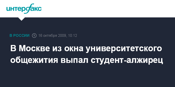 Москва. 16 октября. INTERFAX.RU - В центре Москвы из окна общежития столичного университета выпал студент-алжирец, сообщил "Интерфаксу" источник в правоохранительных органах города в пятницу.