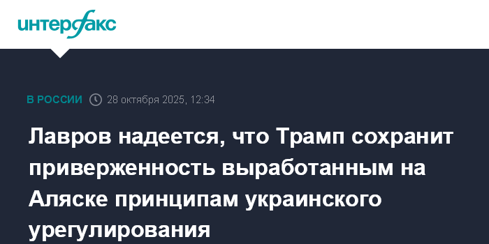 Москва. 28 октября. INTERFAX.RU - В Москве рассчитывают, что президент США Дональд Трамп сохранит приверженность принципам украинского урегулирования, выработанным на российско-американском саммите в Анкоридже на Аляске, заявил глава МИД РФ Сергей Лавров.