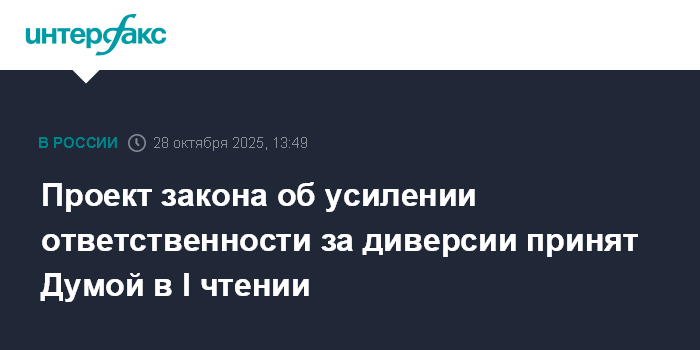 Москва. 28 октября. INTERFAX.RU - Госдума во вторник приняла в первом чтении законопроект об усилении ответственности за диверсионную деятельность.