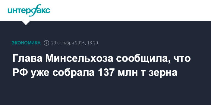 Глава Минсельхоза сообщила, что РФ уже собрала 137 млн т зерна