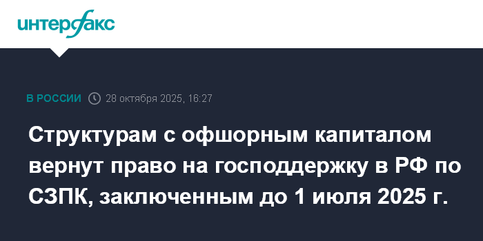 Структурам с офшорным капиталом вернут право на господдержку в РФ по СЗПК, заключенным до 1 июля 2025 г.