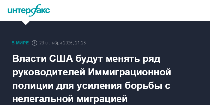 Москва. 28 октября. INTERFAX.RU - Власти США намерены сменить ряд руководителей региональных подразделений Иммиграционной и таможенной полиции США (ICE), чтобы обеспечить требуемый Белым домом подход к задержаниям и высылке нелегальных иммигрантов, сообщает во вторник Axios со ссылкой на источники.
