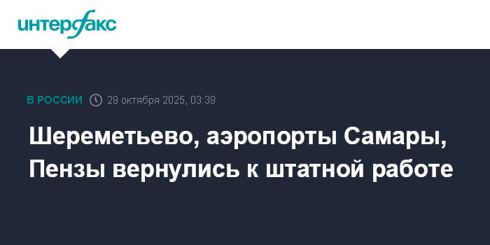 Москва. 29 октября. INTERFAX.RU - Аэропорты Самары и Пензы, а также московский Шереметьево вновь принимают и отправляют воздушные суда, сообщили в Росавиации.