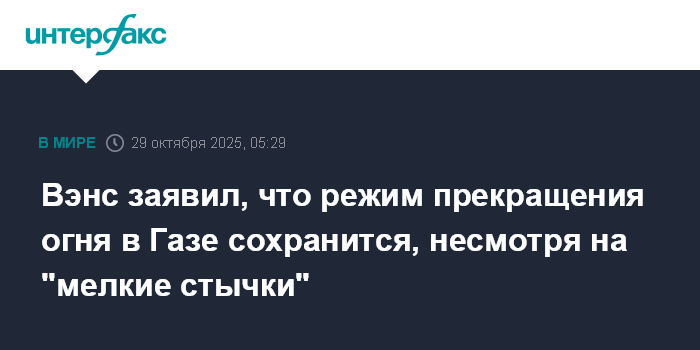 Москва. 29 октября. INTERFAX.RU - Несмотря на столкновение Израиля и палестинского движения ХАМАС накануне в секторе Газа, режим прекращения огня сохранится, заявил вице-президент США Джей Ди Вэнс.