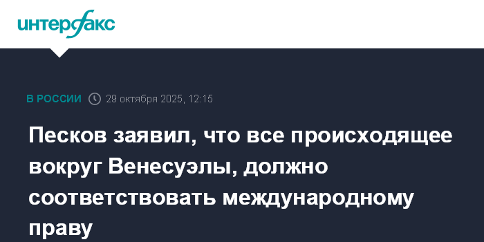 Москва. 29 октября. INTERFAX.RU - Действия США в отношении Венесуэлы должны соответствовать международному праву, заявил пресс-секретарь президента РФ Дмитрий Песков.